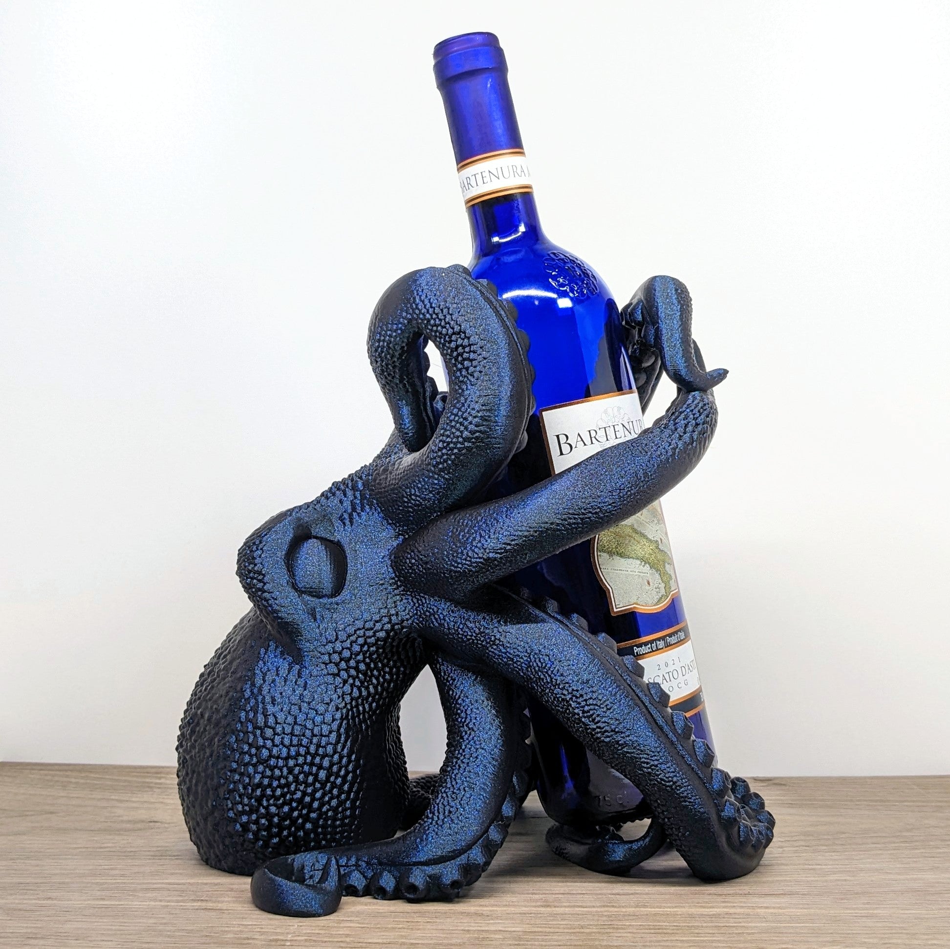 This unique wine holder features an octopus design 3D printed in a stunning deep blue-purple metallic color. Measuring approximately 9" L × 8" W × 9.5" H, it is designed to accommodate most standard 750ml wine bottles.