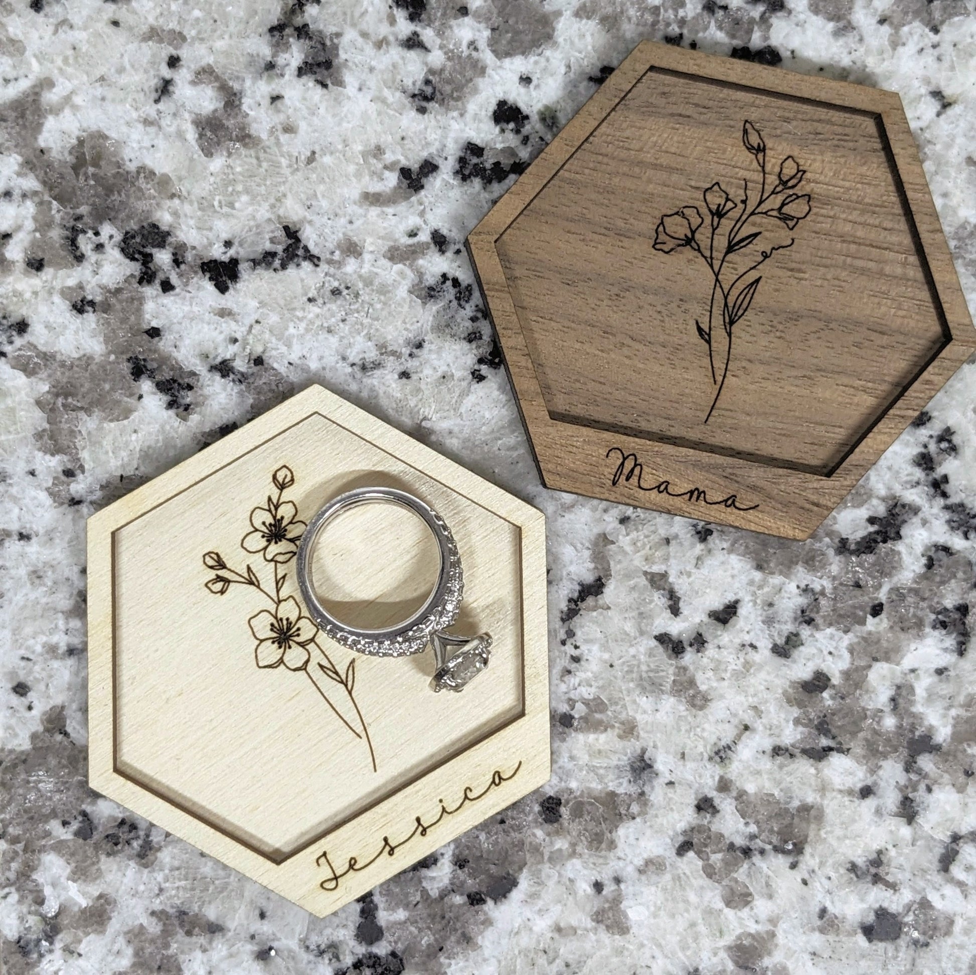 Keep your precious small jewelry items organized and stylish with our mini personalized jewelry trays. Each 2.5" hexagon tray is adorned with your birth flower and personalized with your name, making it a unique and special addition to your home decor. Plus, it makes for a thoughtful gift for your loved ones!