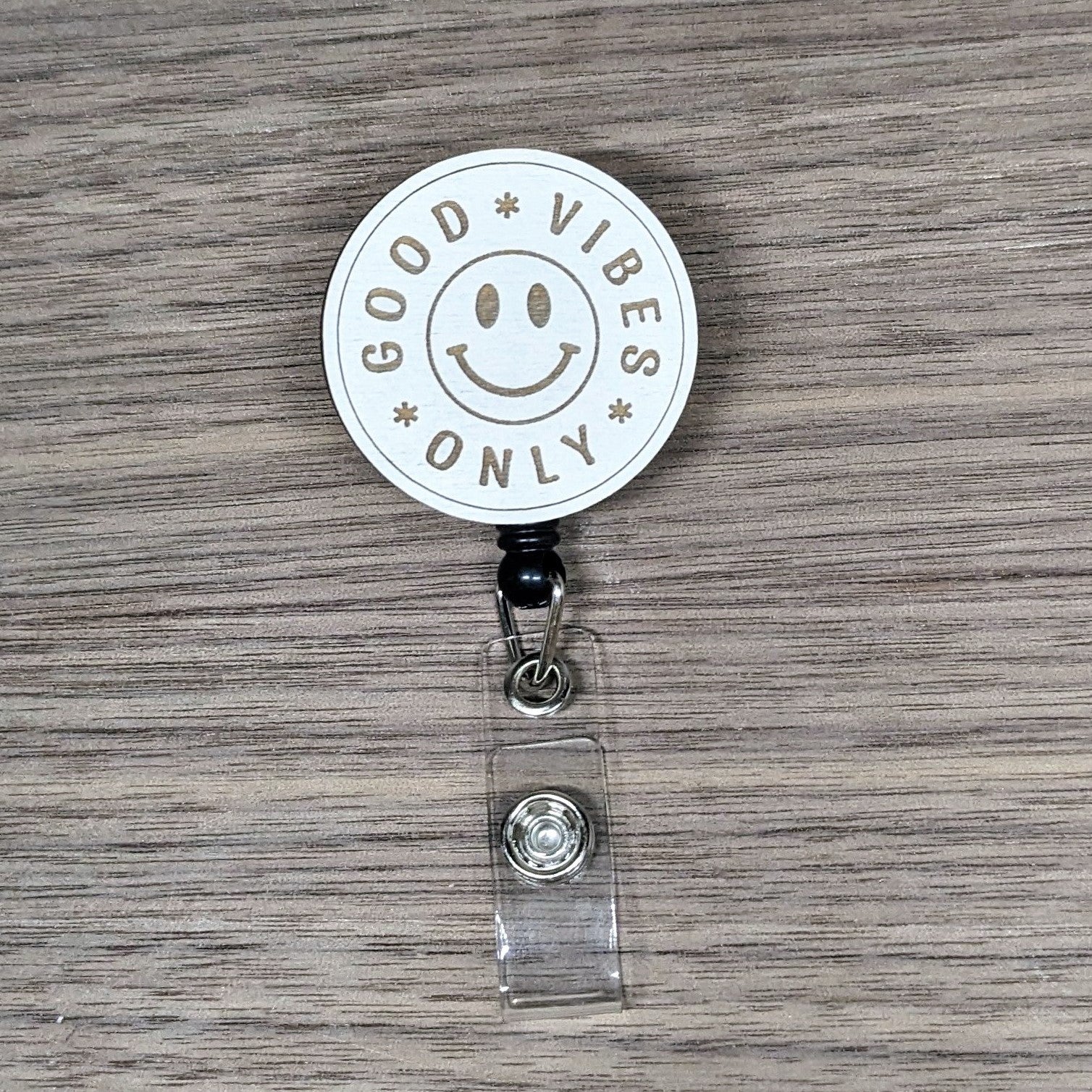 Our badge reels are made with a 1.5" engraved wood round securely attached to a badge holder, which features a sturdy alligator clip and approximately 24" retractable cord. All wood pieces are sealed to remain durable and easy to clean.