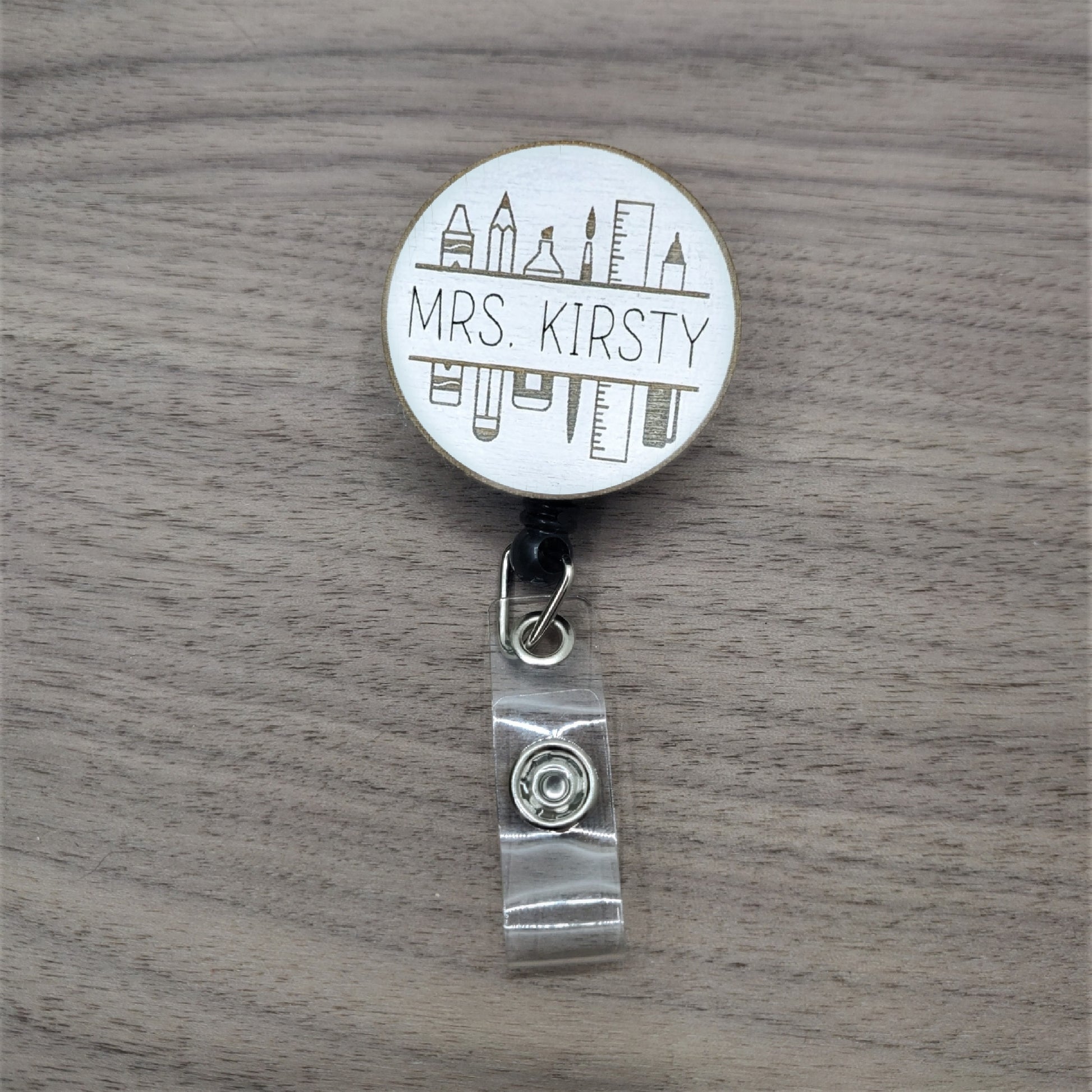 Our badge reels are made with a 1.5" engraved wood round securely attached to a badge holder, which features a sturdy alligator clip and approximately 24" retractable cord. All wood pieces are sealed to remain durable and easy to clean.